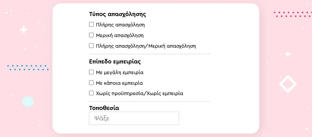 Μην ξεχνάς να χρησιμοποιείς τα φίλτρα αναζήτησης. Αν ψάχνεις με βάση μια συγκεκριμένη θέση εργασίας, μπορείς να επιλέξεις « Αγγελίες εργασίας ». Αν ψάχνεις έχοντας προτίμηση σε συγκεκριμένες εταιρείες, επίλεξε « Εταιρείες ». Επίσης καθόρισε τις υπόλοιπες λεπτομέρειες και προτιμήσεις σου (π.χ. αν προτιμάς πλήρη ή μερική απασχόληση, αν έχεις μπει πρόσφατα στην αγορά εργασίας ή αν έχεις χρόνια εμπειρία, σε ποιο μέρος βρίσκεσαι, αν θες να έχεις δυνατότητες τηλεργασίας, ποιοι είναι οι κλάδοι, οι κατηγορίες θέσης και οι εταιρείες που σε ενδιαφέρουν πιο πολύ. Με κάθε τέτοιο φίλτρο κάνεις narrow-down τα αποτελέσματα, και μπορείς να βρεις κάτι πολύ εξειδικευμένο.