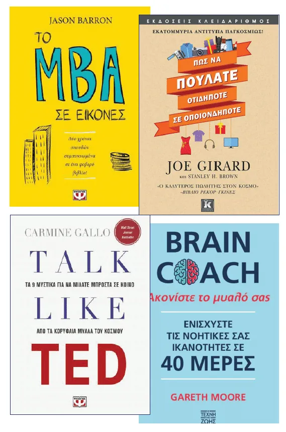 Talk like TED: Τα 9 μυστικά για να μιλάτε μπροστά σε κοινό από τα κορυφαία μυαλά του κόσμου (του Carmine Gallo, εκδόσεις Ψυχογιός). Υπήρχε μόνο στα αγγλικά μέχρι πρότινος, αλλά πρόσφατα εκδόθηκε και στα ελληνικά. Οπότε αν θες να δεις πώς να μεταφέρεις μια ιδέα αποτελεσματικά σε άλλους ή σε κοινό, αυτό είναι το βιβλίο σου.