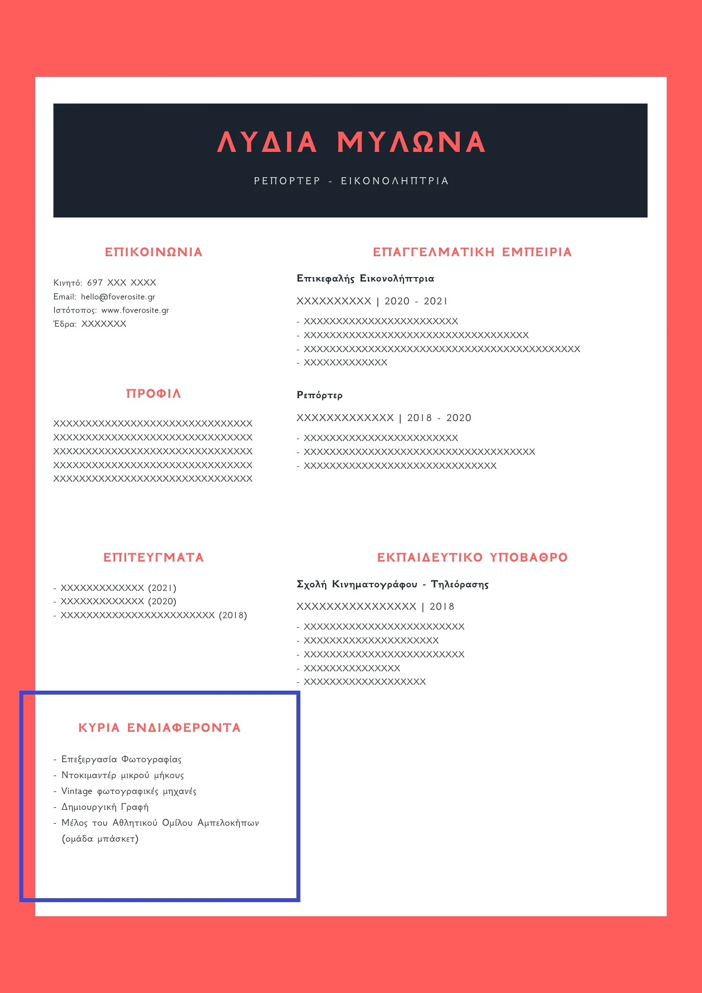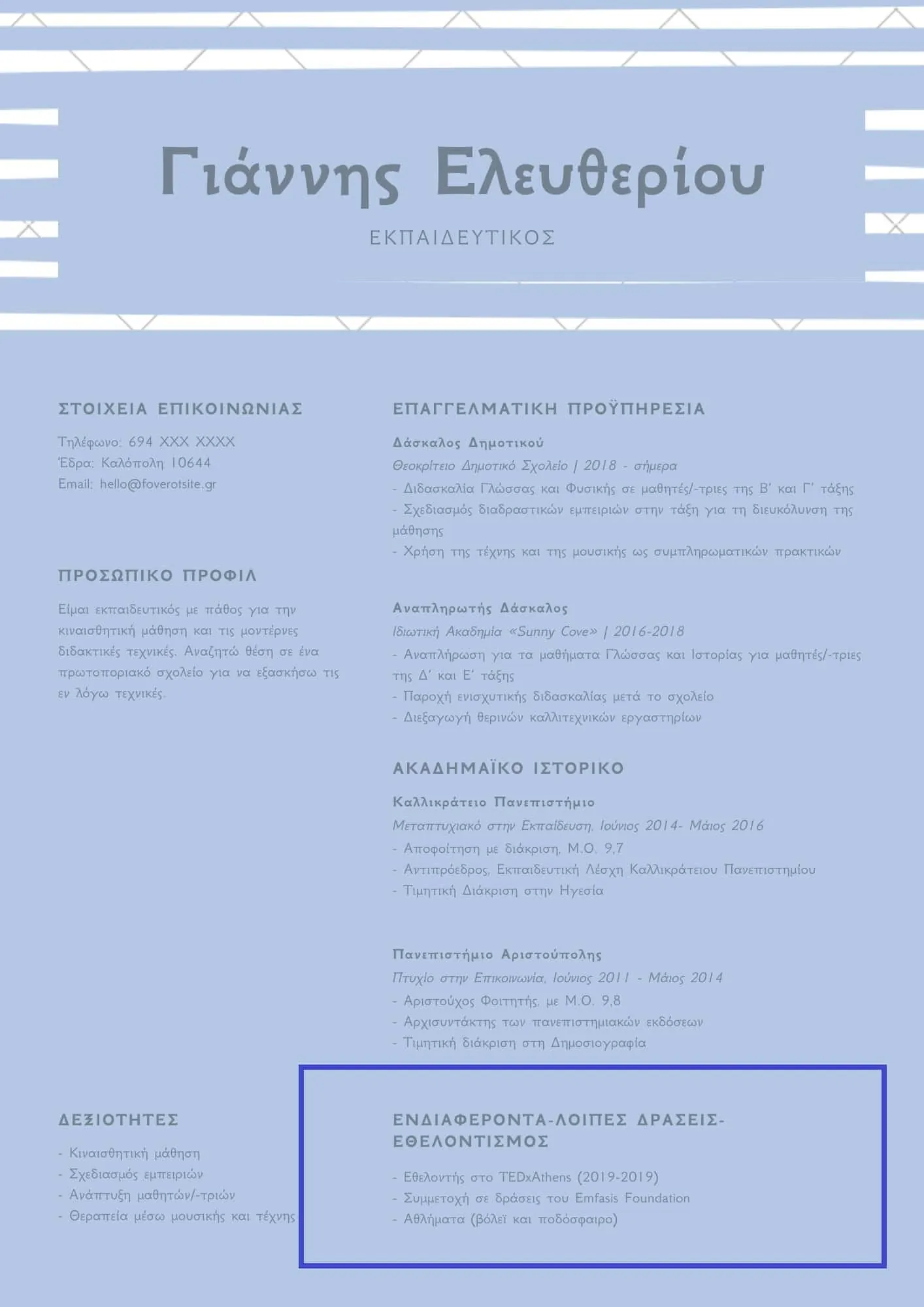 Extra tip: Μπορείς στα ενδιαφέροντά σου να βάλεις αν συμμετέχεις σε κάποια εθελοντική ομάδα, ή σε κοινωνικές δράσεις κλπ. Σύμφωνα με έρευνες, το 82% των managers επιλέγουν βιογραφικά που δείχνουν αγάπη για κάθε είδους εθελοντισμό: αποτελεί βασική ένδειξη ότι ως υποψήφιος ξέρεις να παίρνεις πρωτοβουλίες, έχεις κοινωνικές ευαισθησίες και σε απασχολεί το «ηθικό κομμάτι» της δουλειάς.