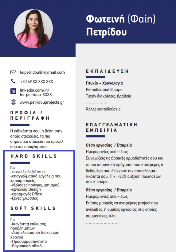 2. Φτιάξε μια συνοπτική λίστα με τα βασικά hard και soft skills που σε διακρίνουν ως υποψήφιο. 3 ως 5 για κάθε κατηγορία, σε ένα ξεχωριστό section. Όπως στο παράδειγμα που σου δείχνουμε: