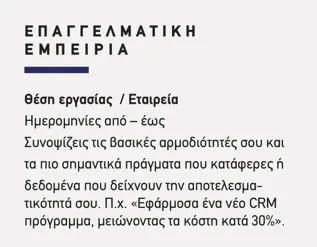 1. Αν είναι μια επιτυχία που σημείωσες στο πλαίσιο της εργασίας, τη γράφεις μέσα στο section ΕΠΑΓΓΕΛΜΑΤΙΚΗ ΕΜΠΕΙΡΙΑ . Για παράδειγμα: