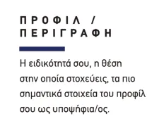 Π.χ. Απόφοιτος της σχολής XXX και νικητής του 1ου βραβείου Νεοφυούς Επιχειρηματικότητας 2021, αναζητά μια επαγγελματική ευκαιρία ως XXX στον κλάδο XXX.