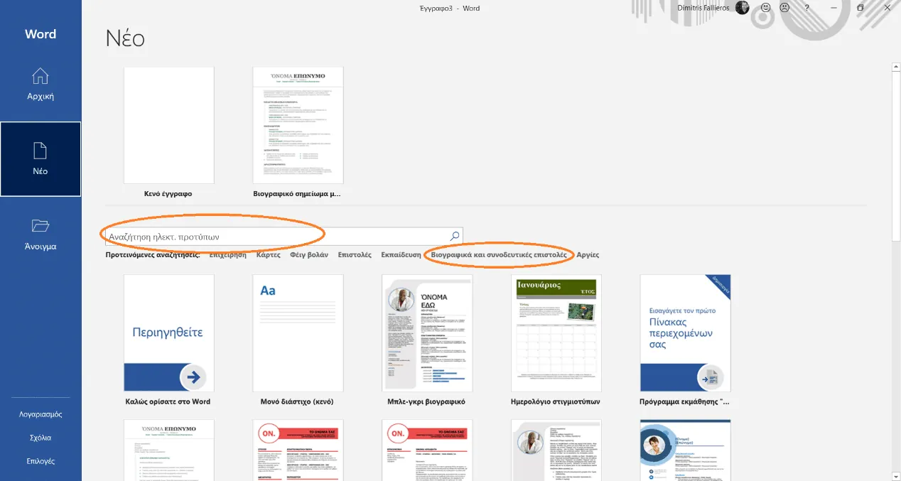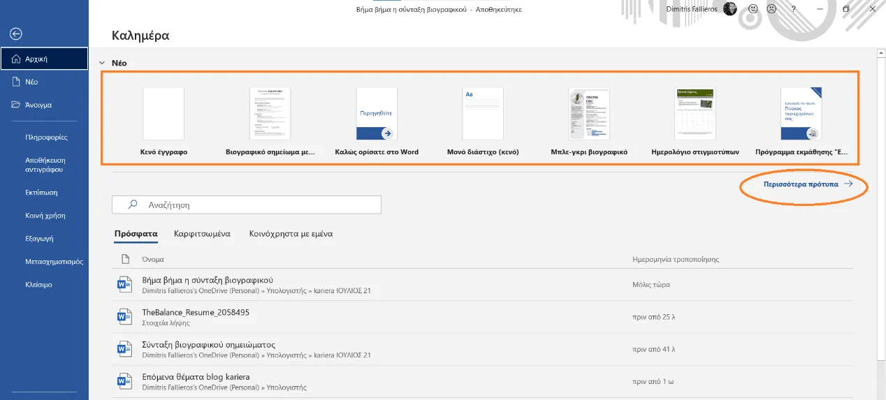 Σε αυτό το παράθυρο που θα σας ανοίξει, θα δείτε μια ποικιλία από διάφορα πρότυπα. Αν δεν βρείτε το πρότυπο για το βιογραφικό, πατήστε «Περισσότερα πρότυπα» .