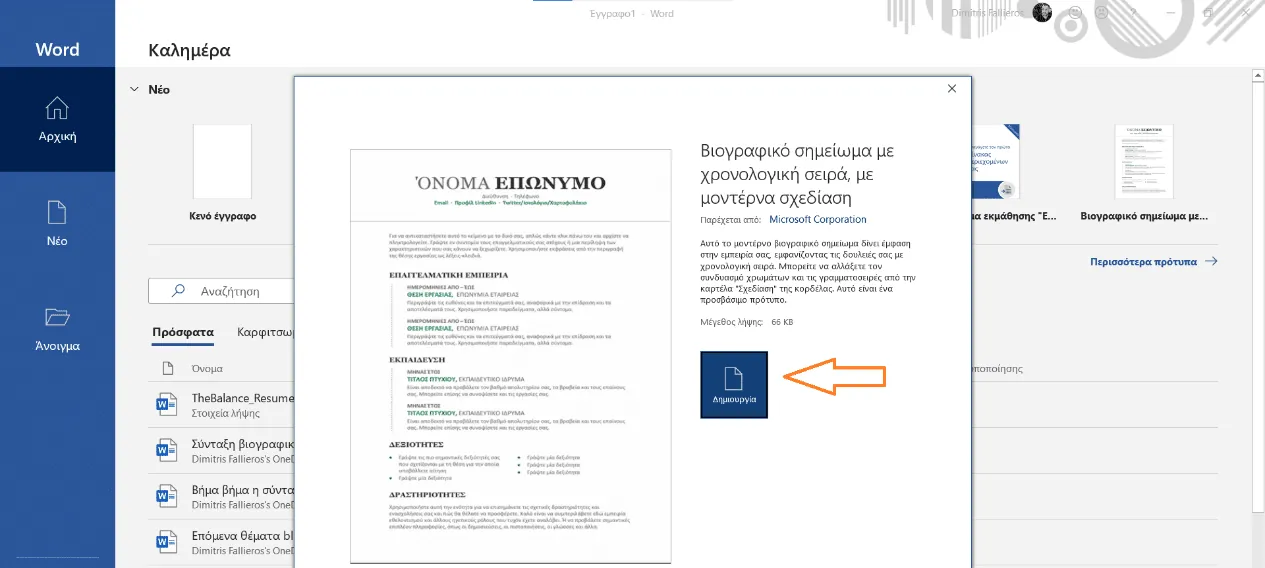 Επιλέξτε το πρότυπο που λέει «Βιογραφικό σημείωμα με χρονολογική σειρά, με μοντέρνα σχεδίαση» ,και αμέσως θα σας ανοίξει αυτό, όπου και θα πατήσετε «Δημιουργία» .