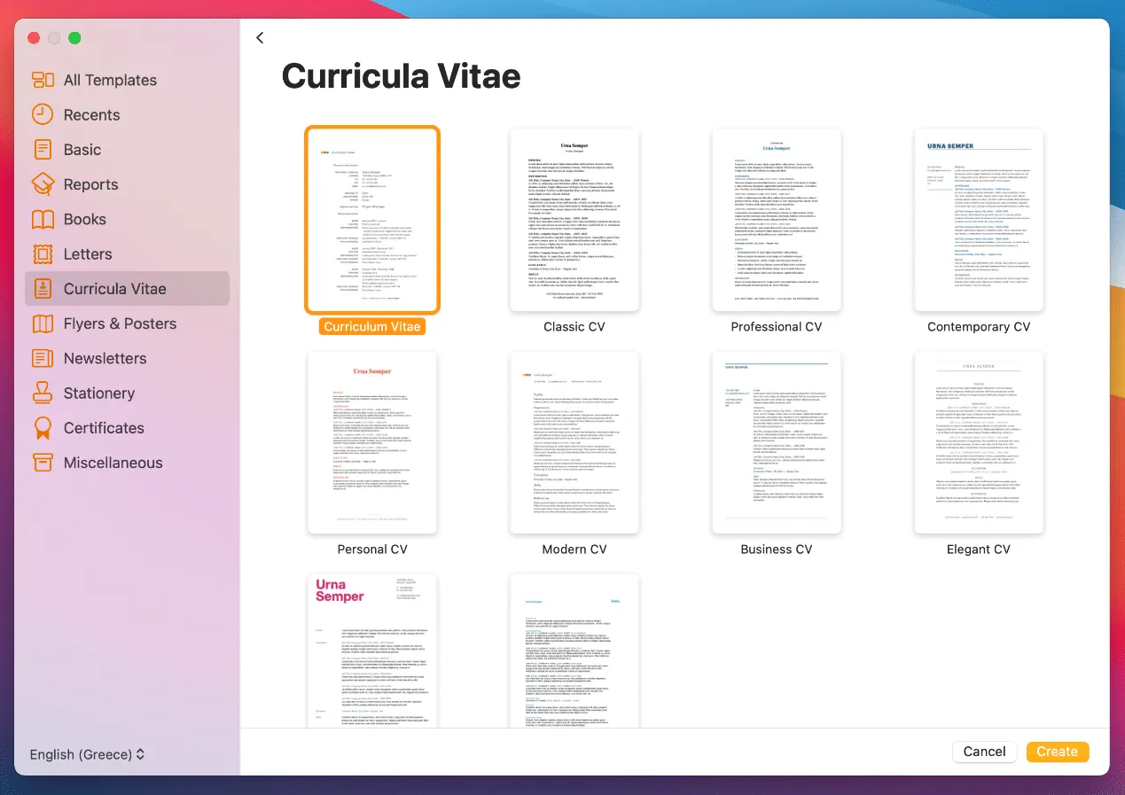 Όταν ανοίξει το Pages, μπείτε στα Templates και βρείτε τα Curricula Vitae (Βιογραφικά σημειώματα).