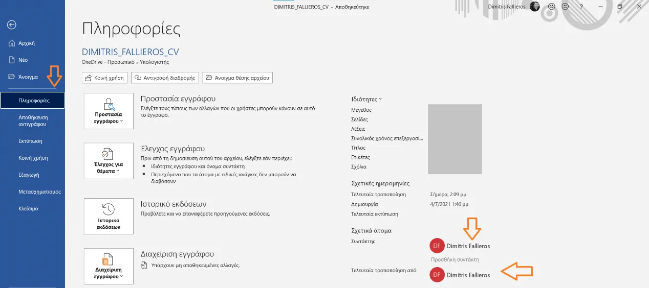 Να σώζετε πάντα το αρχείο σας με λατινικούς χαρακτήρες (π.χ. DIMITRIS_FALLIEROS_CV) για να διευκολύνετε τον recruiter στην αποθήκευση και στην ταξινόμησή του. Επίσης να τσεκάρετε στις Πληροφορίες / Metadata του εγγράφου ότι λέει το δικό σας όνομα. Στο αρχείο σας πηγαίντε πάνω δεξιά και πατήστε «Αρχείο» . Θα σας ανοίξει παράθυρο όπου εσείς θα πατήσετε «Πληροφορίες» .