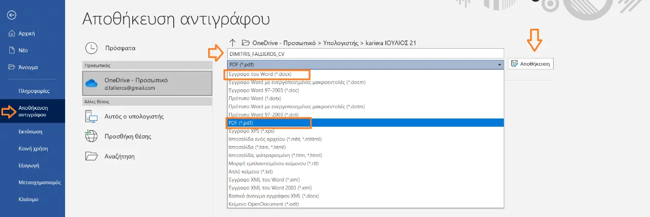 Είναι απλούστατο. Αν έχετε σε Word το βιογραφικό σας, πατήστε πάνω δεξιά το κουμπί Αρχείο και μετά το κουμπί Αποθήκευση αντιγράφου . Θα σας ανοίξει αυτό το παράθυρο: