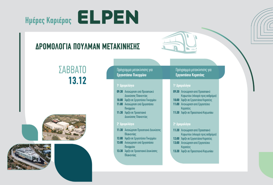 Η ELPEN σε προσκαλεί στις Ημέρες Καριέρας, που θα πραγματοποιηθούν το Σάββατο 13 Δεκεμβρίου 2025, από τις 10:00 έως τις 14:00, ταυτόχρονα και στα δύο εργοστάσια, στο Πικέρμι και στην Κερατέα Αττικής.